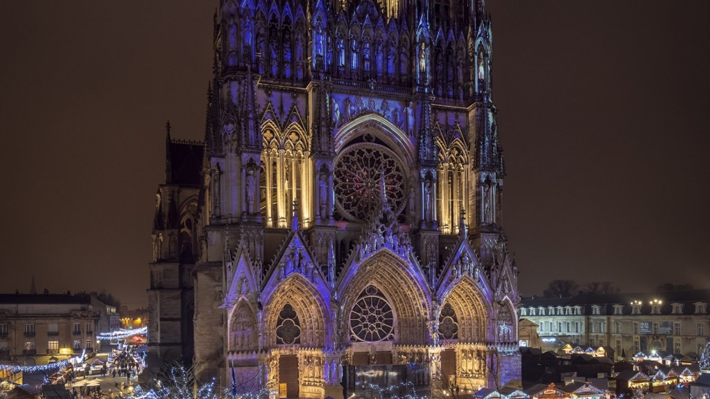 Construite de 1211 à 1345, comme toujours ces bâtiments emblématiques ont beaucoup évolué depuis leur construction initiale. A partir du XI° siècle elle devient le lieu de sacre de la plupart des rois de France. Elle culmine à 81m et ses façades impressionnantes sont de nos jours le théâtre d’un magnifique spectacle son et lumière. Le succès fut tel qu’un deuxième monument de la ville de Reims est aussi devenu le support d’un spectacle incroyable : la basilique Saint Remi.